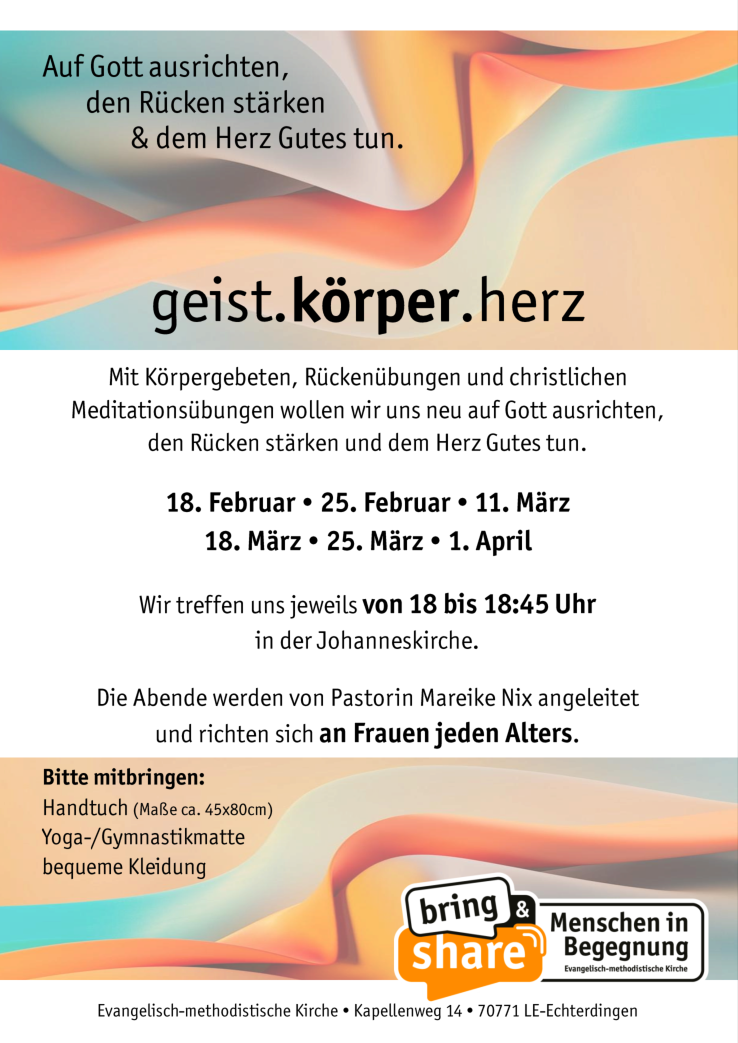 Wir laden Sie ein zum gemeinsamen Leben und Glauben in unseren christlichen Gemeinden. Die Evangelisch-methodistische Kirche ist eine evangelische Freikirche, die ihre Ursprünge im 18. Jahrhundert in England hat. Verbunden sind wir mit anderen Kirchen in der Ökumene. Wichtig ist uns, dass das Vertrauen in Jesus Christus unser Handeln bestimmt, damit die Welt verändert wird. Erfahren Sie hier mehr über die EmK.